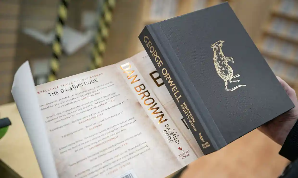 "Wake up! We are sleepwalking into a totalitarian regime!" says British artist David Shrigley. He collected six thousand copies of The DaVinci Code, pulped them and used the paper to print an edition of Nineteen Eighty-four, now out of copyright in the UK. Nothing against Dan Brown, Shrigley says, it could have been any trashy novel. I like the cover art.